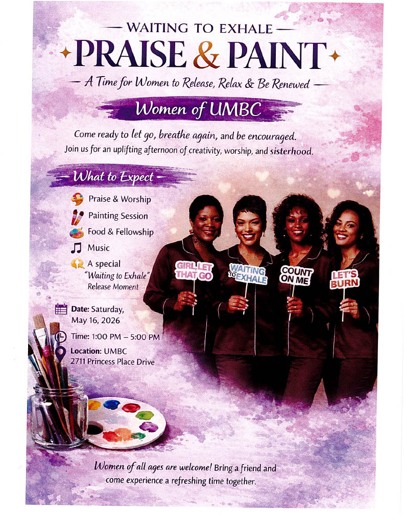 Come relax, laugh and exhale in a safe place with other women of faith. On Saturday, May 16, 2026 from 1 pm to 6 pm here at UMBC join us for an afternoon of Waiting To Exhale - Praise and Paint – a time for women to release, relax and be renewed. You can expect Praise & Worship and a Painting Session to show your creativity. There will be food, Sisterhood fellowship, music and a special “Waiting to Exhale” Release Moment. Women of all ages are welcome! Bring a friend and come experience a refreshing time together. Please sign-up using the list on the table in front of the Office where flyers are also available.